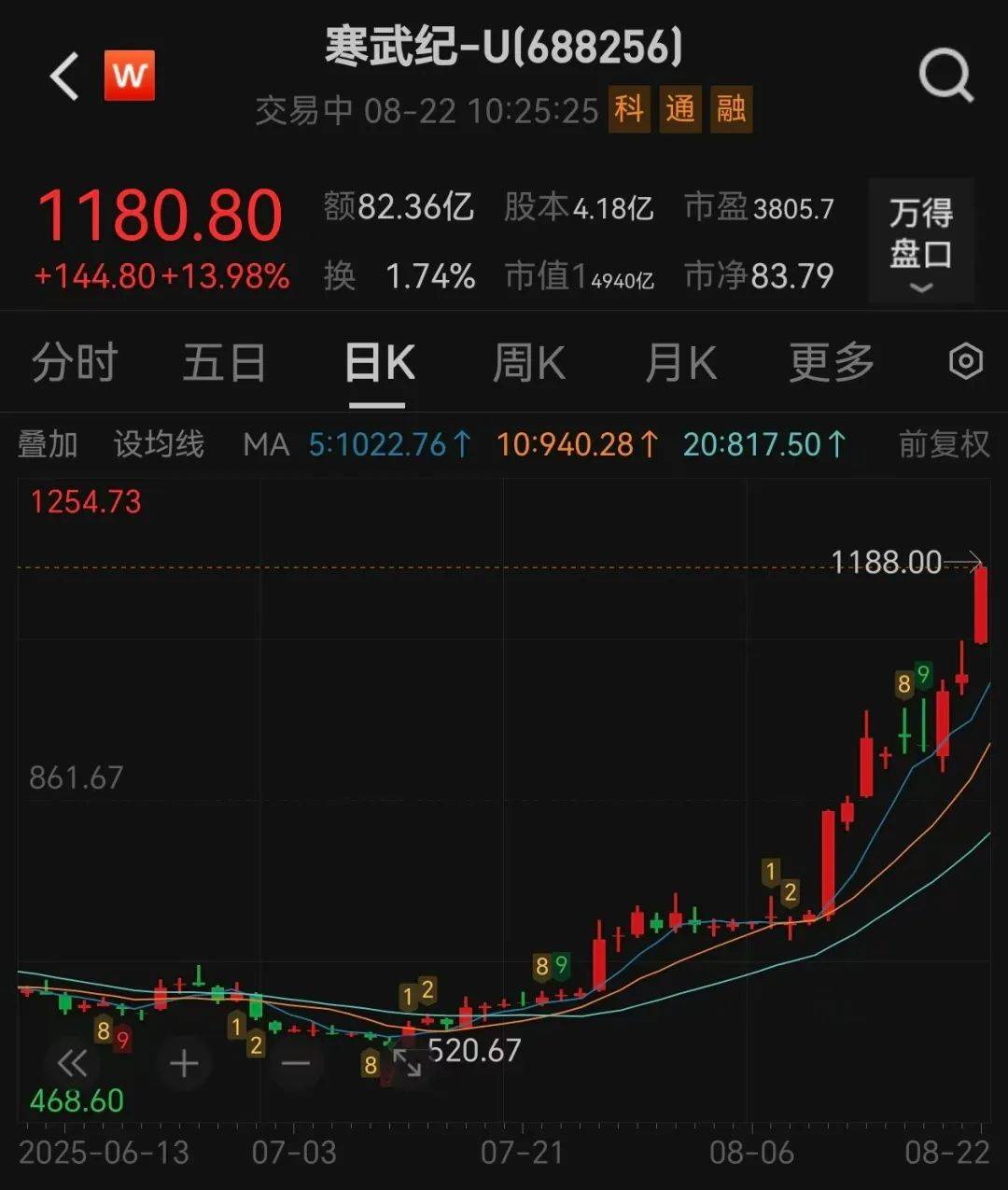 而在昨天(8月21日),寒武纪股价已创新高,市值站上4400亿元。截至昨日收盘,寒武纪成交额以119.3亿元居于科创板第一。