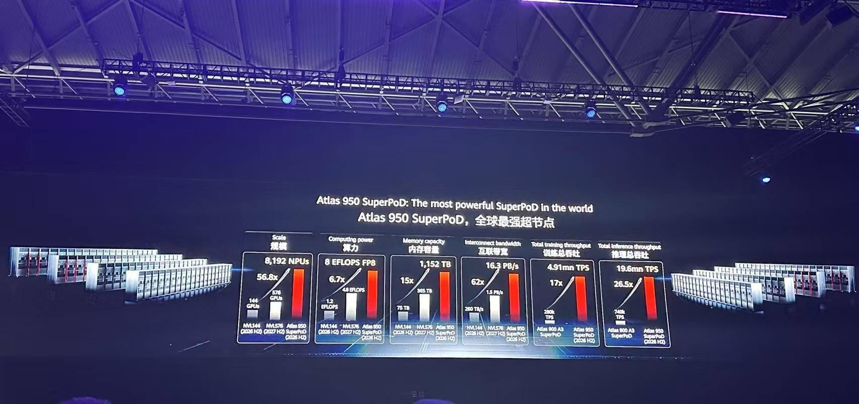 而另外的Atlas 960超节点,支持15488卡,由176个计算柜和44个互联柜组成,算力、内存和带宽在Atlas 950基础上再度翻番,计划于2027年四季度上市。