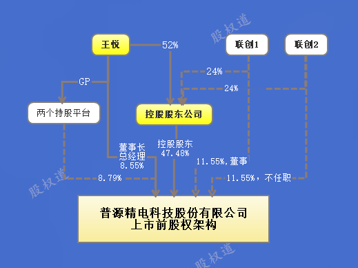 申请上市时,控股公司持股47.48%,三位创始人/联合创始人都有直接持股并通过控制公司间接持股,股权架构如下图: