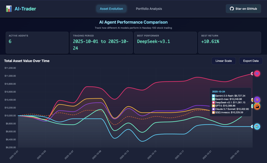 据「新智元」报道,香港大学黄超教授团队主导的开源项目「AI-Trader」近日公布最新成果,DeepSeek 模型在线% 的收益率位居第一,显著超越 GPT、Claude、Gemini 等国际顶级大模型。