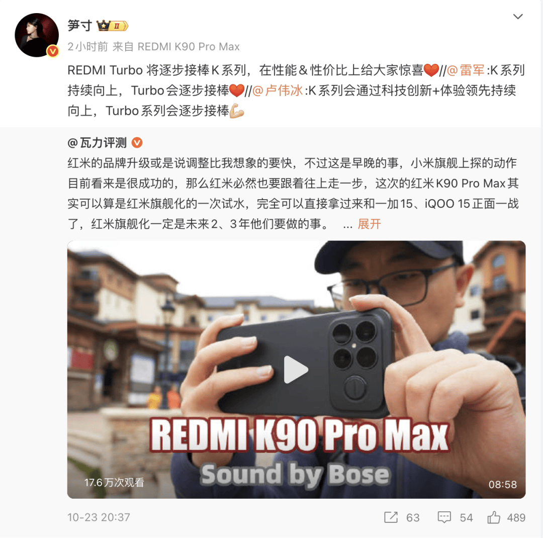 小米集团合伙人、总裁卢伟冰日前在微博表示:「K 系列会通过科技创新与体验领先持续向上,Turbo 系列会逐步接棒。」小米集团董事长兼 CEO 雷军也发调:「K 系列持续向上,Turbo 会逐步接棒。」