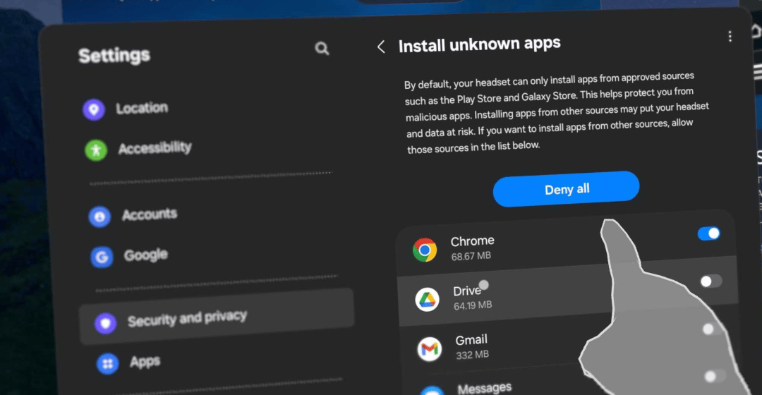 UploadVR 指出,在 Galaxy XR 上,用户只需通过内置浏览器(如 Chrome)下载 APK,并在「安全与隐私」设置中授权安装「未知应用」,即可完成安装。