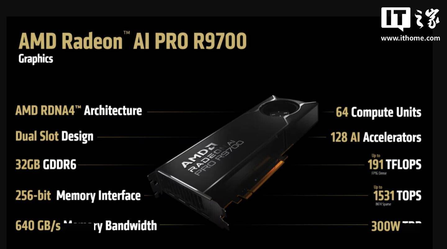 据介绍,R9700 显卡基于 RDNA 4 架构打造,专为本地加速 AI 工作负载而设计,内置 4096 个流处理器,是 AMD 旗下的第二代 AI 加速器产品,INT4 算力最高可达 1531 TOPS,相比上一代产品 AI 性能最多提升 2 倍,适应多种 AI 工作负载。