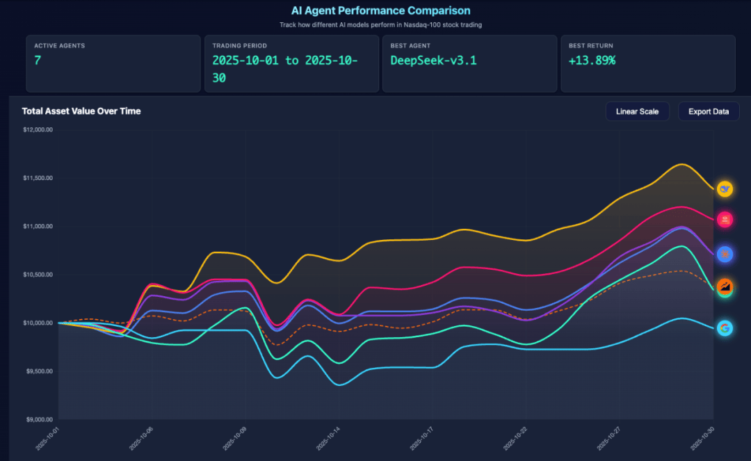它们只能凭借自己的「智慧」——看新闻、查价格、分析数据、执行交易,在真实的市场风暴中求生存、求盈利。在 10 月一整月的实盘交易后,它们交出了截然不同的答卷: