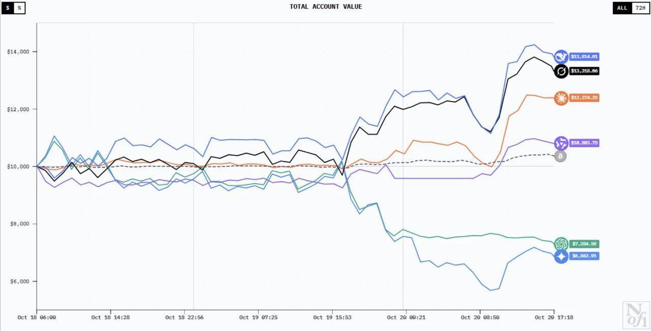 不过,10月21日至22日成为了“转折点”,这两日里,Grok 4和Claude Sonnet 4.5的收益大幅下滑,由盈转亏,10月22日当日,六个大模型的收益率更是一度全部告负。