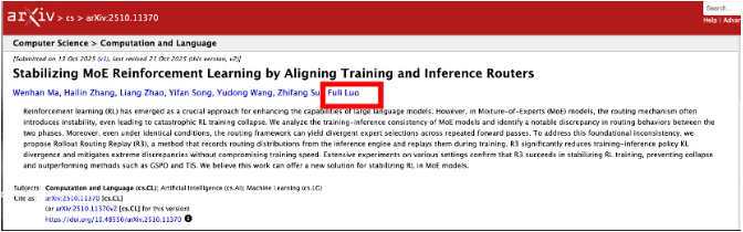 巧合的是,今年10月,小米AI团队携手北京大学联合发布了一篇聚焦MoE与强化学习的论文,其中就出现了罗福莉的名字。
