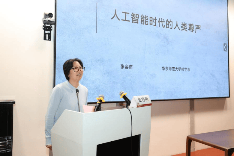 华东师范大学哲学系张容南教授发言的题目为“人工智能时代的人类尊严”。张老师指出,当AI在理性、自律等能力上超越人类,西方传统以“能力优越性”为基础的尊严观便可能失去支点。为此,她构建了“具身性尊严”理论,主张尊严并非仅源于可比较的能力优势,而是根植于人类作为具身存在的独特性,即人的脆弱性与易受伤害性。张老师进一步分析了AI如何通过程序性侵害、关系性贬低、依赖性物化三重路径削弱人类尊严。为应对这些挑战,她构建了包含人类主导权、数据自决、响应脆弱性等七项原则的尊严评估机制,明确AI应“补充而非替代”人类,关键场景需保留人类复核节点。制度层面还应实现跨学科伦理评估、伦理与法律约束等真实落地。如此,才能推动构建一个人机共生、尊重人类尊严的未来。