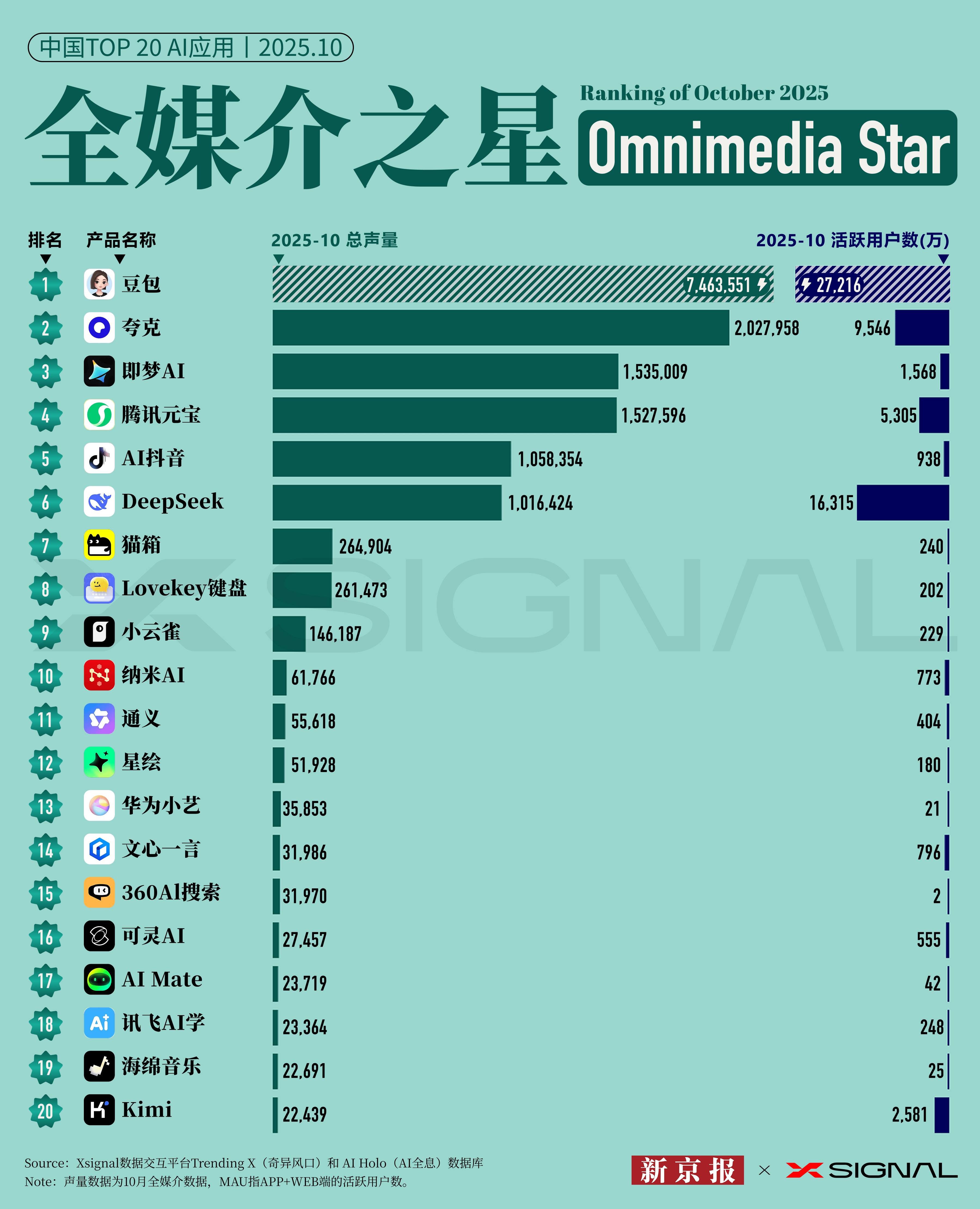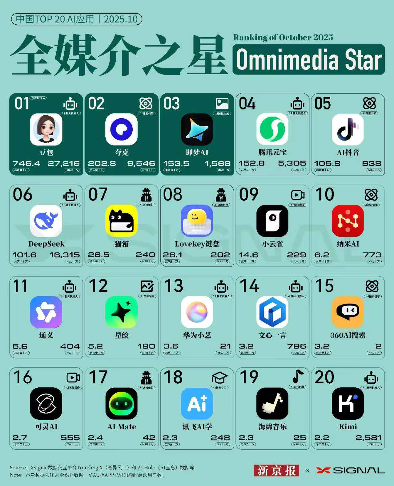 这份榜单由新京报AI研究院与Xsignal联合发布,根据全媒介声量梳理出2025年10月排名前20的国内AI应用,同时统计了应用的产品类别、所属企业及最新MAU(月活跃用户)数据,为观察国内AI应用发展趋势提供重要参照,这也是榜单自发布以来的第四期。